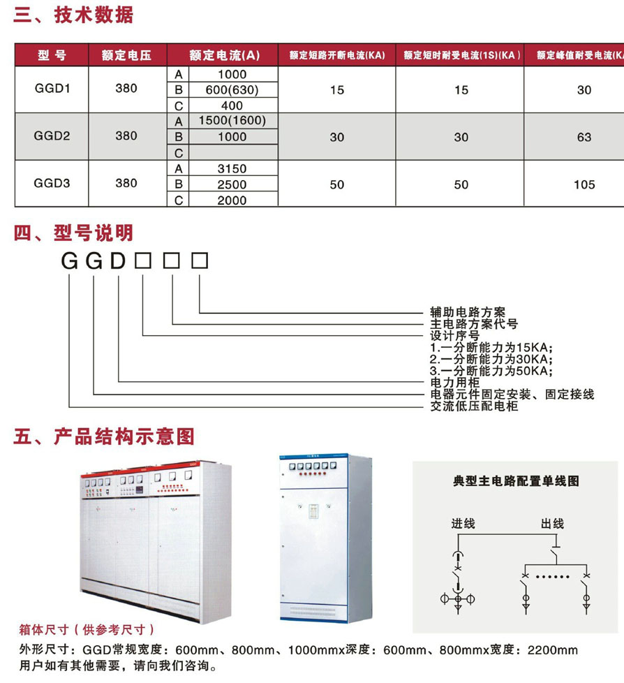 >固定封閉式開關柜GGD型交流低壓配電柜是根據能源部,廣大電力用戶在設計部門的要求,按照安全、經濟、合理、可靠的原則設計的新型低壓配電柜。本公司生產的GGD型交流低壓配電柜2008年通過國家強制性產品(CCC)認證,具有分斷能力高,動熱穩定性好,電氣方案靈活、組合方便,系列性,實用性強、結構新穎,防護等級高等特點??勺鳛榈蛪撼商组_關設備的更新換代產品使用。