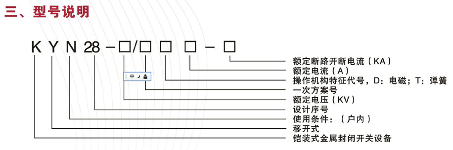 >KYN28鎧裝中置式金屬封閉開關設備適用于3.6-12KV三相交流50Hz電網,作為接受和分配電能,并對電路實行控制、監測和保護之用。可用于單母線、單母線分段系統或雙母線系統。開關設備符合IEC298《額定電壓1KV以上52KV及以下交流金屬封封開關設備和控制設備》、IEC694《高壓開關和控制設備共用條款》、我國GB3906《 3-35KV交流金屬封閉開關設備》及DL404《戶內交流高壓開關柜訂貨條件》,德國DIN.VDE670((額定電壓1KV以上的交流開關設備》等標準的要求,并且有完善,可靠的防誤操作功能。