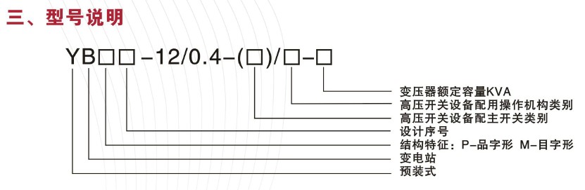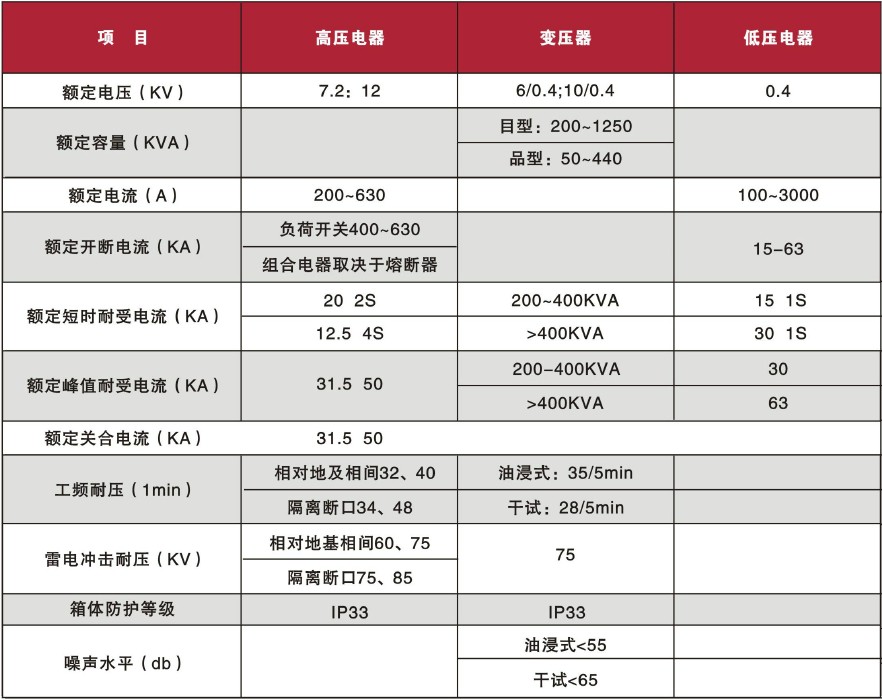 本產品由高壓配電裝置,變壓器及低壓配電裝置聯接而成。分成三個功能隔離室,即高壓室、變壓器室和低壓室,高低壓室功能齊全,高壓室由環網柜組成一次性供電系統布置成環網供電、終端供電、雙電源供電等多種供電方式。還可裝設高壓計量的要求,變壓器可選擇油浸式變壓器和干式變壓器。變壓器室設置起動強迫風冷系統,低壓室根據用戶要求可采用面板或柜裝式結構組成用戶所需供電方案,有動力配電、照明配電、無功功率補嘗,電能計量等多種功能,滿足用戶的不同要求,并方便用戶的供電管理和提高供電質量。